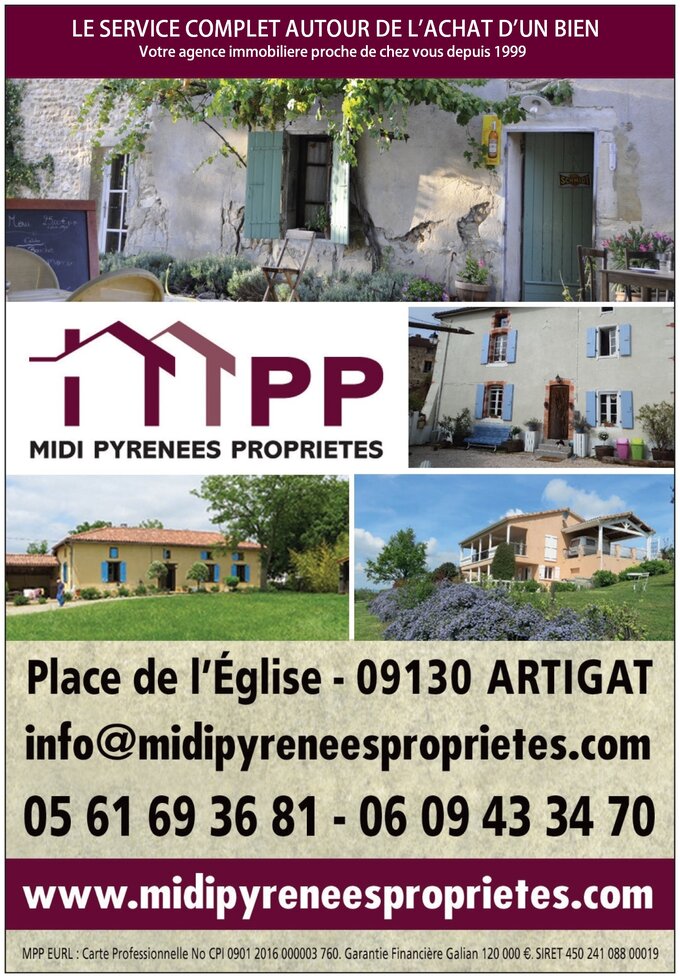 Midi Pyrénées Propriétés Mesdames Anneke de Gier et Magali Cascales Place de l’Eglise 09130 Artigat Téléphone : 05 61 69 36 81 Email : info@midipyreneesproprietes.com Site web : www.midipyreneesproprietes.com Flyer MPP
