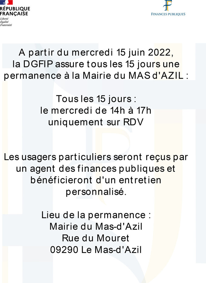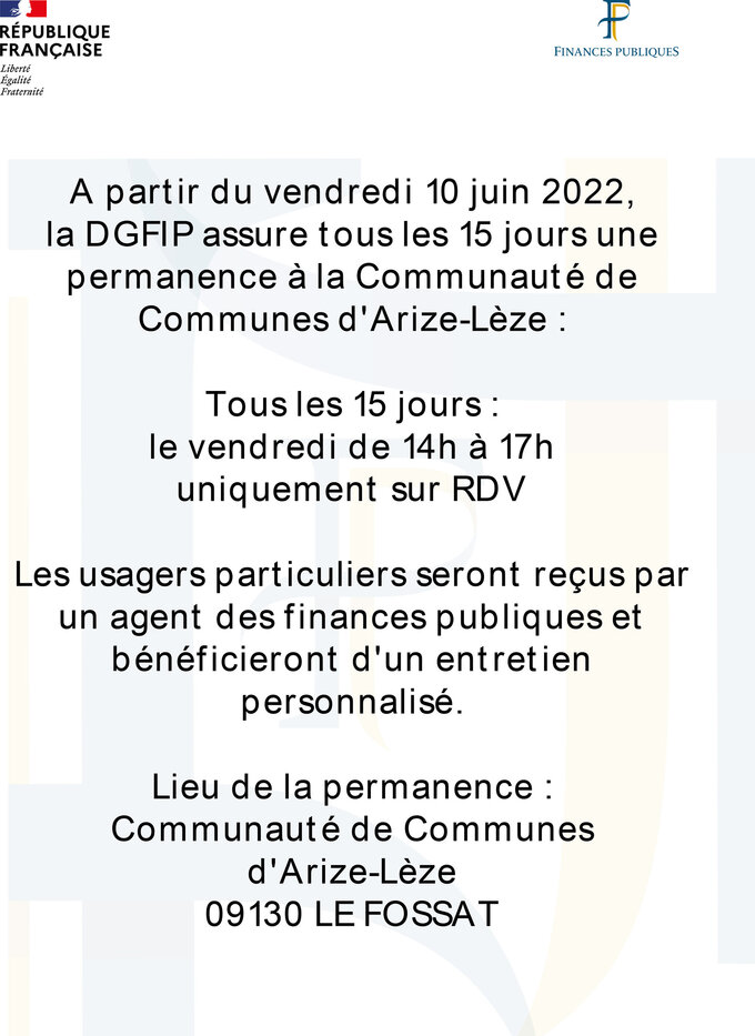 A compter du 10 juin 2022, les agents du Service des impôts des particuliers (SIP) de Pamiers assureront à la Communauté de Communes Arize Lèze une permanence tous les 15 jours au profit des usagers :